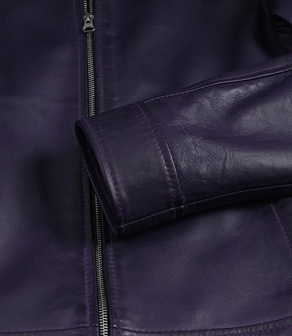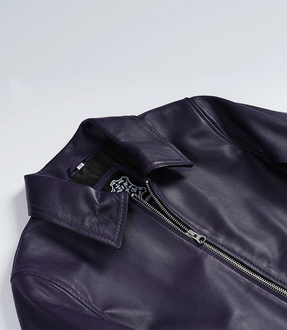 Conçue pour la minimaliste moderne, cette veste en cuir d'agneau violet pour femme arbore une coupe Harrington épurée rehaussée d'une touche de couleur fraîche. Son col chemise et sa fermeture éclair discrète facilitent la superposition des vêtements, du matin au soir. Sa doublure douce offre un confort optimal par-dessus des t-shirts, des pulls et des basiques de bureau. Portez-la avec un jean, une robe ou des bottes pour un look quotidien qui ne passe pas inaperçu.