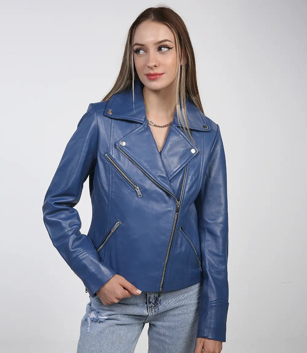 Introducing the Ninfa Women's Blue Asymmetric Leather Biker Jacket: a seamless blend of classic looks and contemporary flair, where style seamlessly intertwines with a bold attitude.